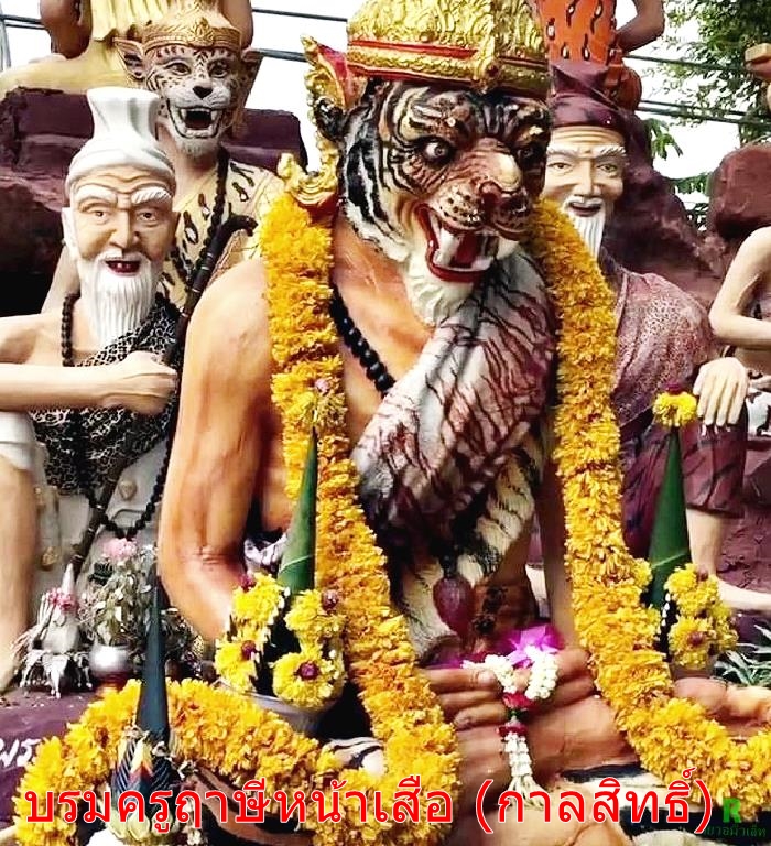 สำหรับพระฤาษีหน้าเสือ หรือปู่ฤาษีกาลสิทธิ์ นั้น มีตำนานอยู่ว่า ท่านเป็นฤาษีที่มีตบะบารมีอันแก่กล้า โดยในครั้งหนึ่ง ฤาษีหน้าลิงได้ขอให้ท่านแสดงฤทธิ์เดชเนื่องจากเห็นว่าเป็นฤาษีที่มีฤทธิ์มาก ท่านฤาษีกาลสิทธิ์ จึงได้รับคำขอ โดยการจำแลงกายให้ตนเองมีหน้าเป็นเสือ แต่การจำแลงกายทุกครั้งท่านจะใช้น้ำมนต์ล้างเพื่อทำให้หน้ากลับคืนสู่สภาพเดิม แต่เนื่องจากครั้งนั้น ฤาษีหน้าลิงได้เทน้ำมนต์ทิ้ง ทำให้ฤาษีกาลสิทธิ์ไม่อาจกลับมาเป็นหน้าเดิมได้ จึงมีหน้าเป็นเสือตลอดไป