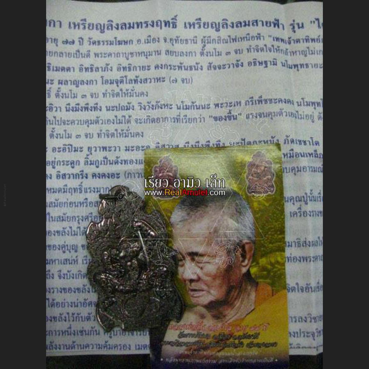 Ceremony: there are five grand ceremonies of this powerful amulet:1.LP Aun strongly blessed 3 months by himself.2.LP Aun, LP Garlong and LP Daeng strongly blessed in Monday 9 March C.E.2009 at Wat Suthat.3.LP Aun took the amulets to join blessed in a ceremony of “Wai Kru52” by LP Garlong in Wednesday 9 September C.E.2009 at Wat Suthat.4.LP Aun took the amulets to join blessed in a ceremony of “Trimas ChanaPhai52” by LP Daeng in Saturday 3 October C.E.2009 at Wat Suthat.5.LP Aun strongly blessed the amulets in a grand ceremony of “Trimas52” by LP Aun was a chairman in ceremony.Powerful: Ling Lom Song Rit Coin by LP Aun has many supernatural powers such as making a worshiper to be invulnerable. In addition, there is great power about protect the worshiper from bad things, black magic and dangers. By the way, Ling Lom SaiFa Coin has superb powers about bring wealth, luck, charm, sex appeal and good business to a worshiper.LIMITED EDITION MADE 4999 ITEMS