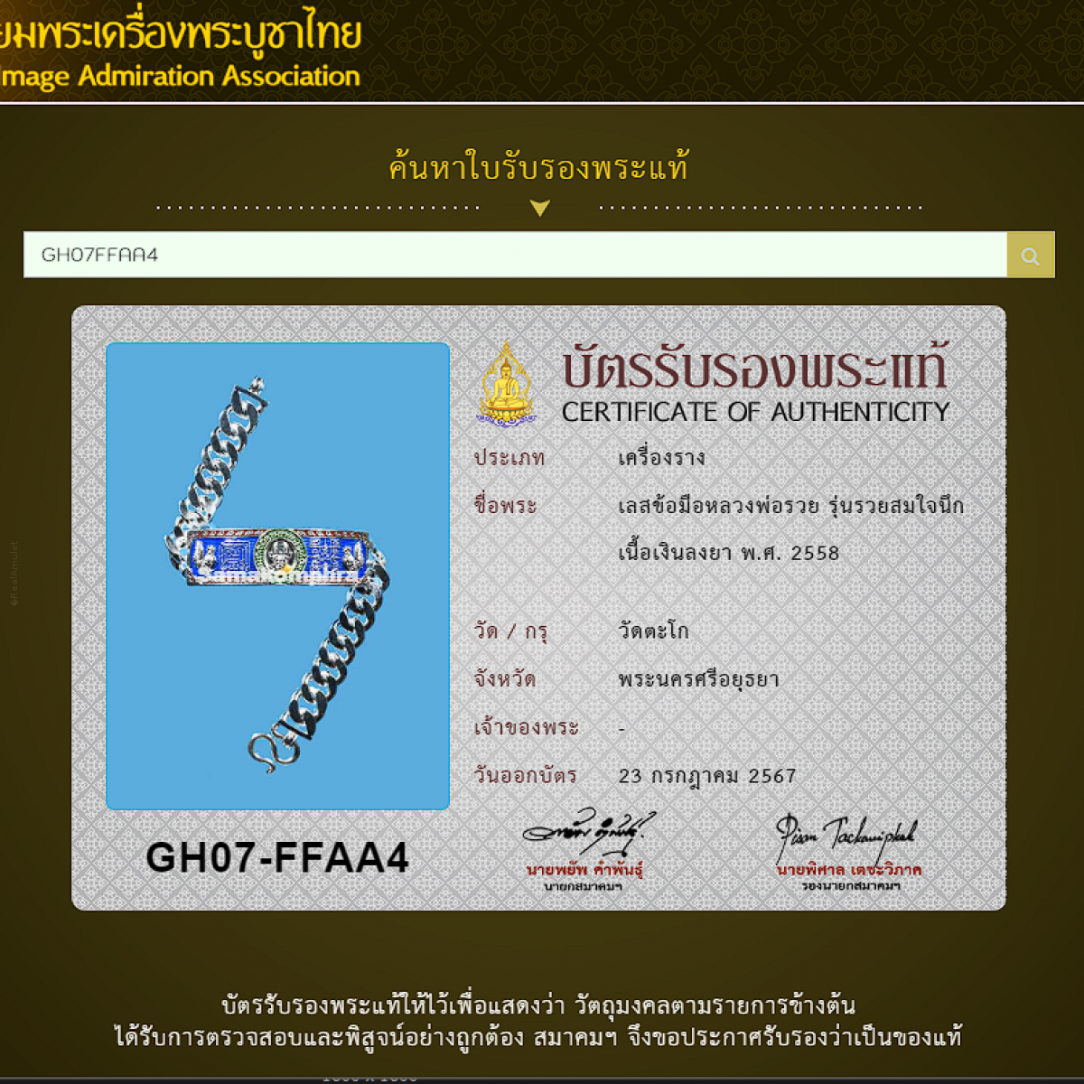 Certificate Samakom 925 Silver Bracelet Somjaineig Ruay Be2558 Thai Amulet 18597